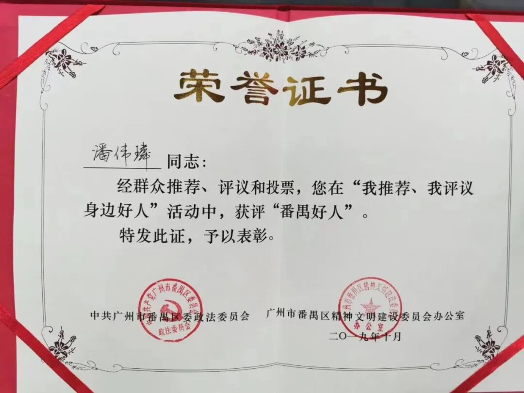 潘伟璘被评为“2018年度番禺好人”获奖证书