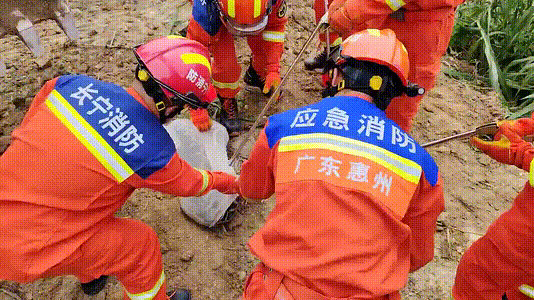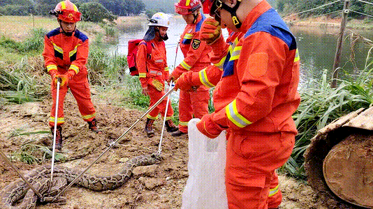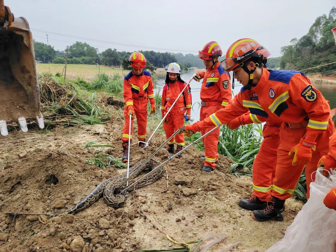 挖机已经用泥土将蛇暂时压住,因蟒蛇的体积较大,现场消防救援人员将泥土破开后利用多个蛇夹进行控制,随后将其送进专用蛇袋,移交给林业。