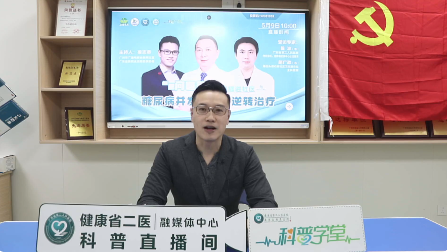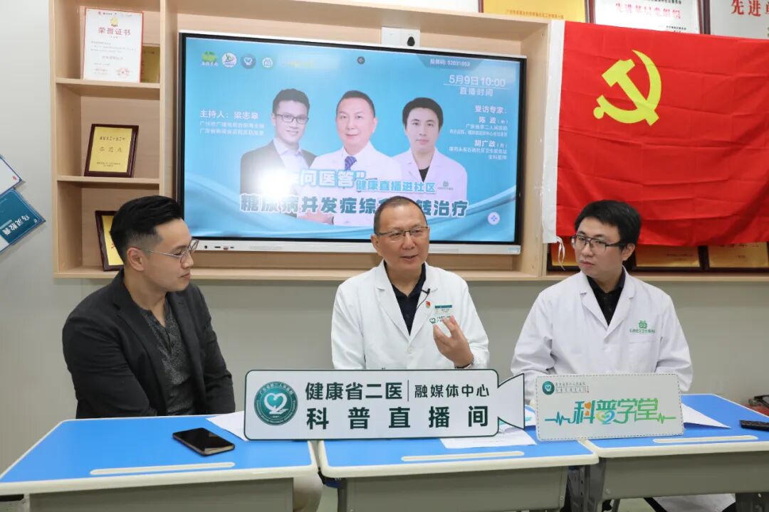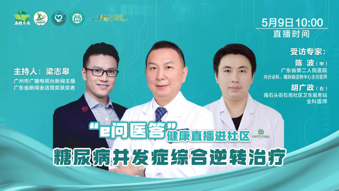 2024年5月9日,“e问医答·科普学堂”健康科普(直播)进社区第三轮第3场(累计第51期),联合海珠区南石头街石岗社区卫生服务站,邀请广东省第二人民医院内分泌科、糖胖病逆转中心主任医师陈波与海珠区南石头街石岗社区卫生服务站全科医师胡广政联合讲科普——糖尿病并发症综合逆转治疗。