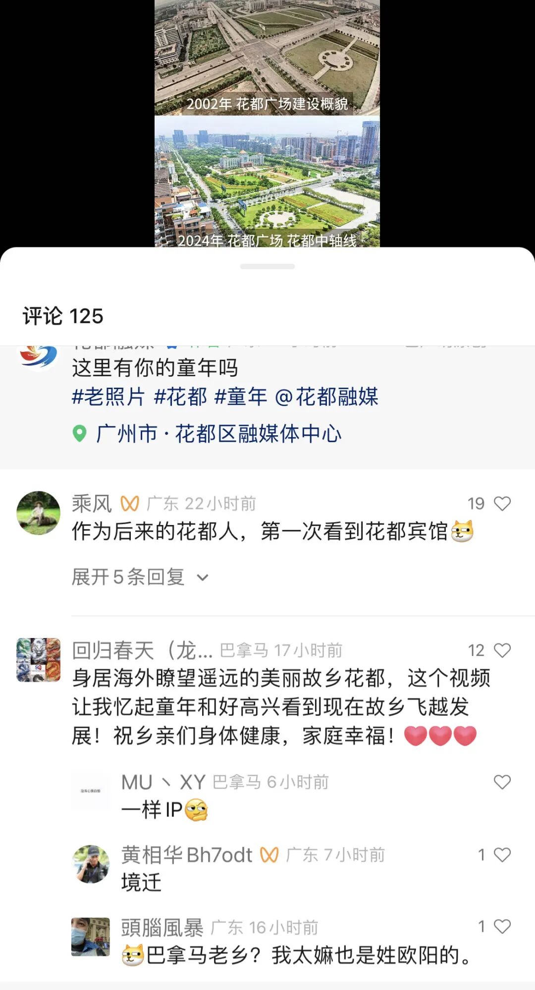 身居巴拿马的志美说:我是花都人哦!看到这个视频让我好久才回过神来,满满的回忆,一下子以前的花都都变得这么的飞黄腾达,好久没有回去了,感觉有点陌生,身居在巴拿马我对自己的故乡发展速度非常自豪和骄傲,希望大家越来越好,身体健康!
