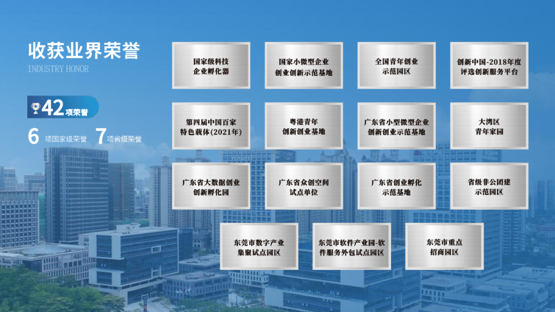 作为东莞市集“东莞市软件产业园”、“东莞市数字产业集聚试点园区”“东莞市工业数字大厦”三牌于一身的数字经济特色产业园区,入驻企业超过600家,先后荣获“国家级科技企业孵化器”、“国家小型微型企业创业创新示范基地”、“全国青年创业示范园区”、“广东省创业孵化示范基地”、“松山湖优秀孵化器第一名”等国家、省、市、区等42项荣誉。