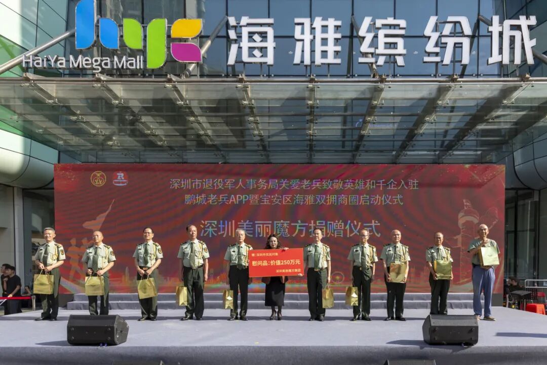 仪式过程中,播放了鹏城老兵APP宣传视频和优待服务企业商家访谈短片,全面介绍鹏城老兵APP功能特点,优待服务企业代表通过视频发表了感言体会。市退役军人事务局办公室负责同志介绍了鹏城老兵入驻企业、双拥商圈及拥军门店情况,并指出优待商家企业,无论公司大小、实力强弱、优惠程度,都深受老兵欢迎,都是老兵商城尊贵的一员,更是全深圳拥军队伍里走在第一方阵的先锋。在明快的音乐声中,深圳美丽魔方集团董事长陈琼作为爱心企业家中的优秀代表,向全市优抚对象捐赠6000余份总价值250万元的礼品。出席仪式的领导为鹏城老兵APP老兵商城千余户优待企业(项目)50家代表和宝安新安拥军门店10家代表授牌,并共同摁下商圈启动按钮,宝安区海雅双拥商圈正式启动。