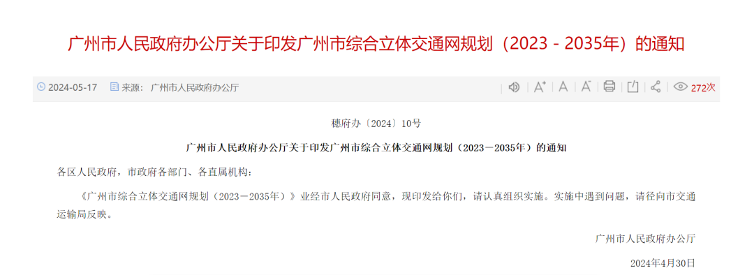 5月17日,广州市政府办公厅印发《广州市综合立体交通网规划(2023-2035年)》(下称《规划》)。