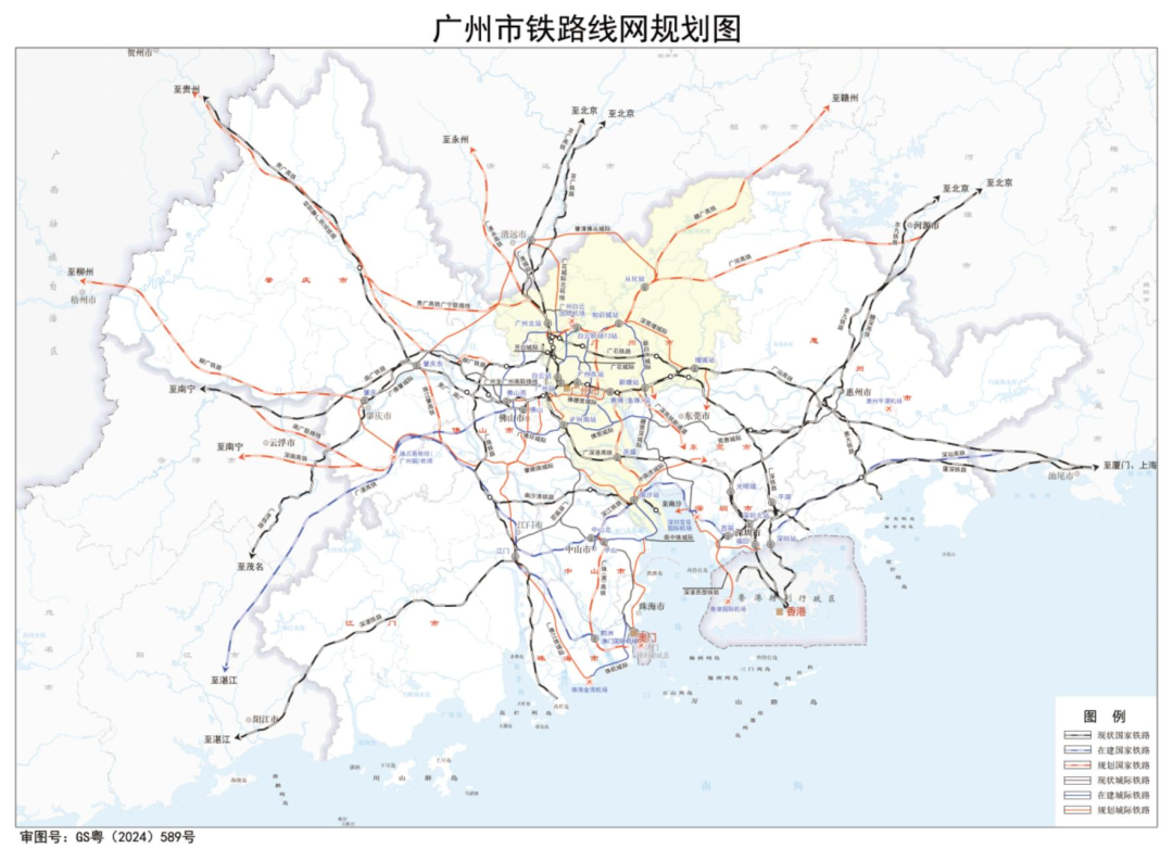 新增广州至珠海(澳门)高铁、广深高铁新通道,强化广州与珠澳、深港联系。