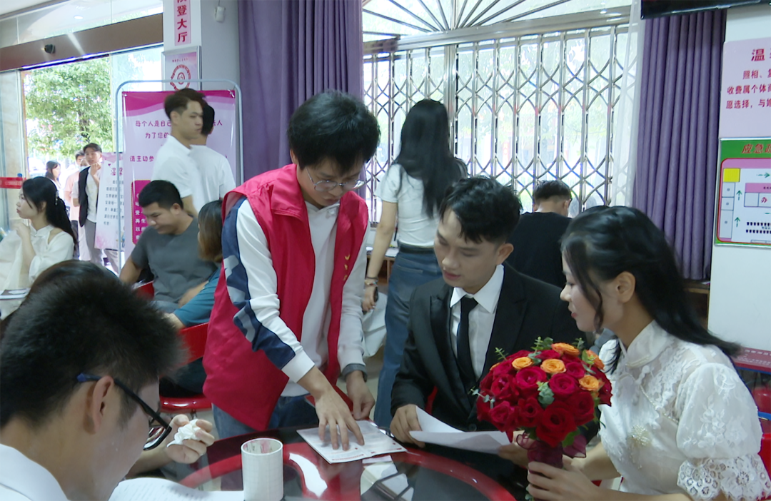 在登记现场,工作人员还对新人们进行婚俗改革宣传以及提供婚前辅导服务,引导他们尽早完成婚前婚后角色转变,树立正确的婚恋观和家庭观,自觉抵制高价彩礼,婚事新办简办。