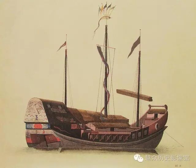 清代外销画中的大眼鸡船,可见船身通红,故而又被称作红头船。
