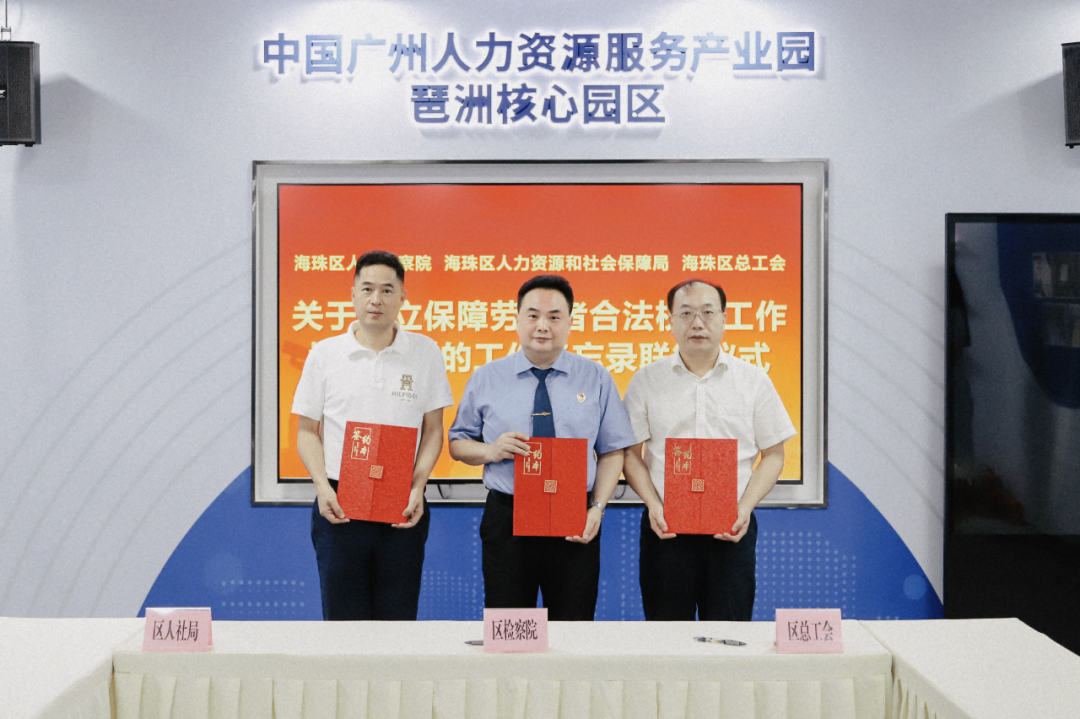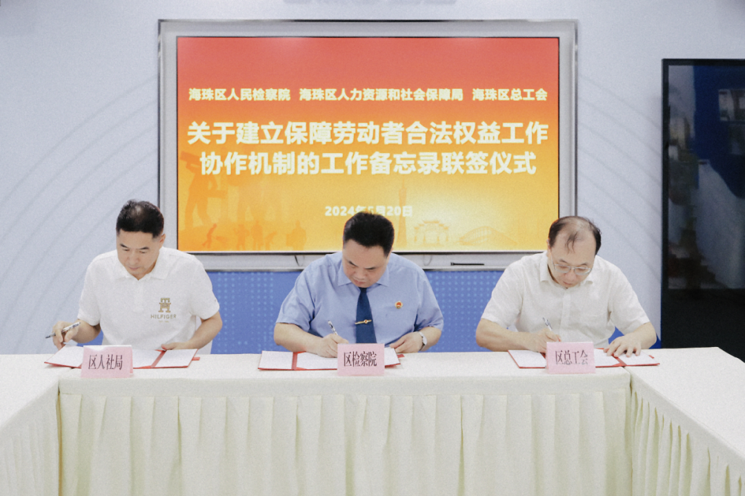 为切实保障劳动者合法权益,构建和谐劳动关系,5月20日,海珠区人民检察院与海珠区人力资源和社会保障局、海珠区总工会联合签署《关于建立保障劳动者合法权益工作协作机制的工作备忘录》,并举行座谈会。区检察院党组副书记、副检察长凌耀波、区人社局副局长周君健、区总工会常务副主席凡宝成出席会议,区检察院、区人社局、区总工会相关人员参加会议。