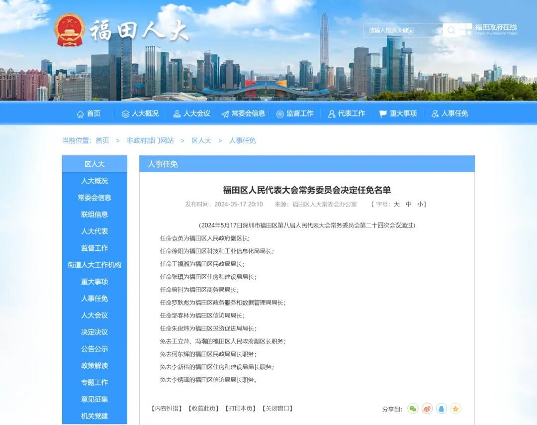 据奥一网此前报道,5月17日,深圳市福田区第八届人民代表大会常务委员会第二十四次会议召开,通过一批人事任免,其中邹春林被任命为福田区信访局局长。