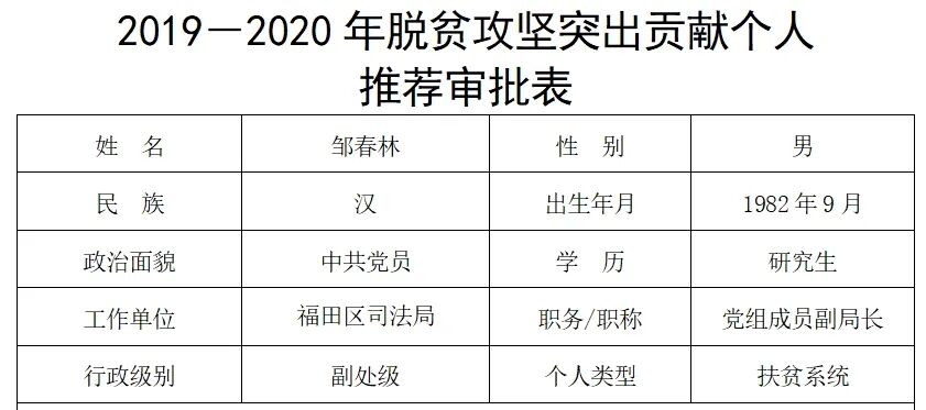 据福田区工业和信息化局官网显示,2021年2月,福田区对口帮扶工作领导小组办公室发布关于2019—2020年脱贫攻坚突出贡献个人拟推荐对象名单公示,邹春林在列。审批表显示,邹春林,男,汉族,1982年9月出生,中共党员,研究生学历。