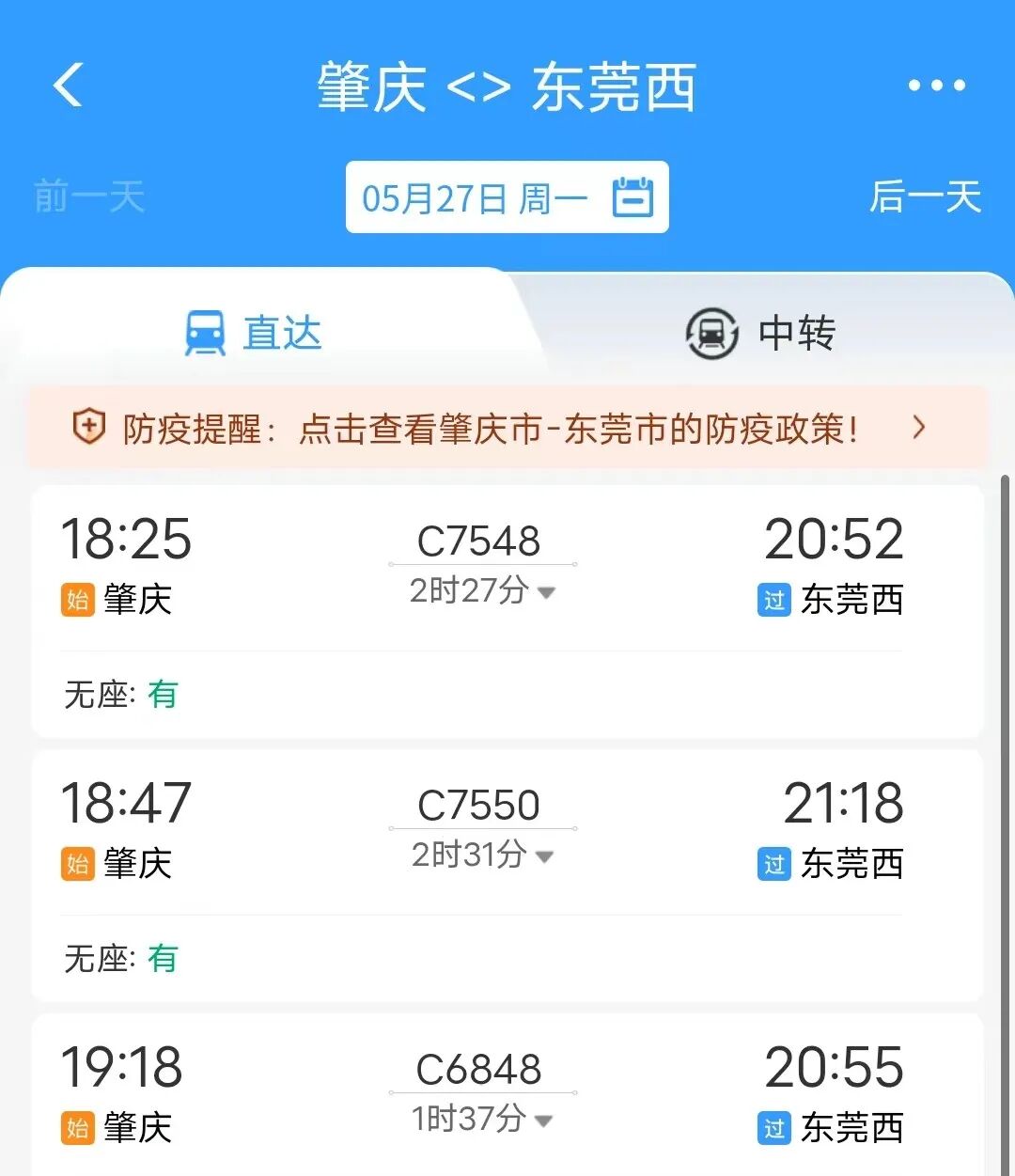 ▲ 以肇庆站至东莞西站的购票界面为例,C开头的班次都是城际列车。