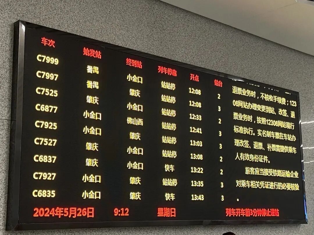 线路全面启用“站站停+大站快车”公交化运营模式,并执行“肇庆站-小金口站”和“佛山西站-小金口站”交路。旅客可通过站台、站厅信息显示屏、车站广播的列车信息,区分“站站停”和“大站快车”,现场还有车站工作人员持手举牌指引。广东城际运营公司提醒,旅客出行可根据自身行程选择相应的列车,并预留充足的时间,避免“踩点”错过,耽误行程。