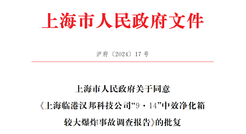 日前,上海市人民政府网站公布了《上海临港汉邦科技公司“9·14”中效净化箱较大爆炸事故调查报告》。