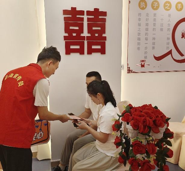 区司法局联合区民政局、区妇联在云安区婚姻登记中心开展了一场别开生面的民法典进婚姻登记处普法宣传活动。普法志愿者为前来登记的新人们递上一本本带有祝福的《民法典》手册,旨在鼓励新人们在享受爱情甜蜜的同时,也不忘构建基于法律认知的健康婚姻关系,更好地引导公众树立正确的婚姻家庭观念,增强自我保护意识。
