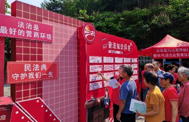 区委依法治区办、区普法办、区司法局联同区普法责任单位在六都镇崖鹰山法治文化主题公园开展民法典宣传暨优化法治化营商环境主题普法宣传活动。此次活动特别设置了知识问答墙,为群众提供了智慧碰撞的舞台,通过这种互动式的学习体验,群众在欢声笑语中就将《中华人民共和国民法典》(以下简称《民法典》)的条文知识内化于心,不仅有趣还有“料”。