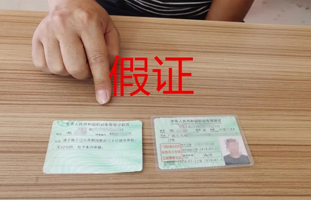 5月14日10时许,国道323线田阳区三雷路段,百色市公安局交警支队直属五大队执勤人员对一辆桂MJ***9的重型牵引车例行检查时,驾驶人苏某出示了一本“A2”驾驶证。民警对这本驾驶证进行仔细检查后,发现该证质地粗糙,字体、印章可疑,疑似假证。