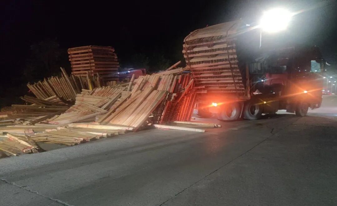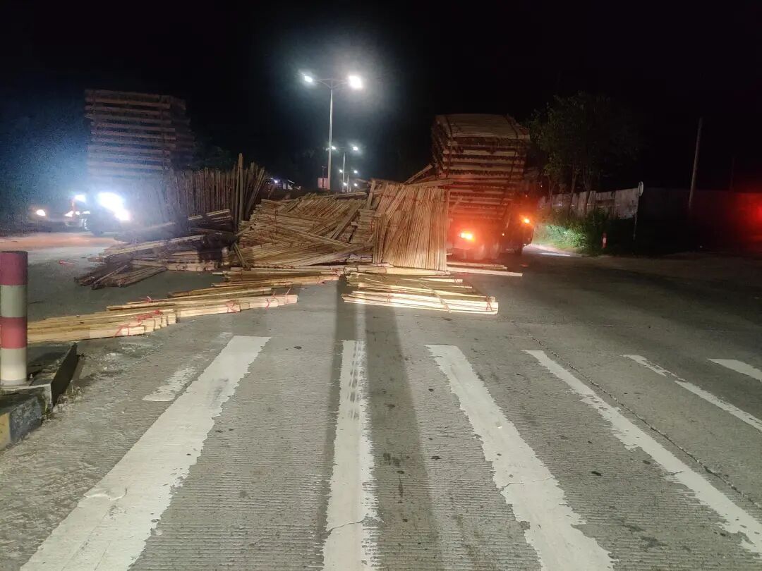 近日,清远交警巡逻至106国道时,一辆运载木材的重型货车横向停放在道路,大量木材散落在路面,双向四车道的被散落的货物阻挡变成了两车道,造成了短时间的交通缓行。