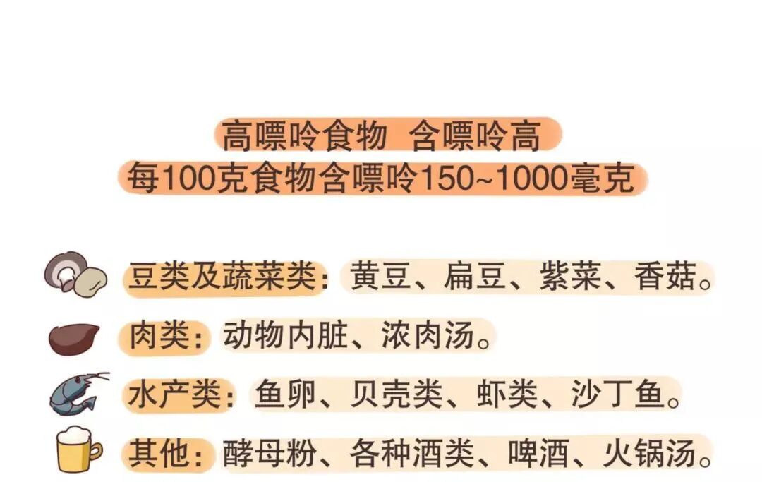 限制高嘌呤食物:嘌呤在体内代谢后会产生尿酸,因此应避免或限制高嘌呤食物,如动物内脏、海鲜、红肉等。