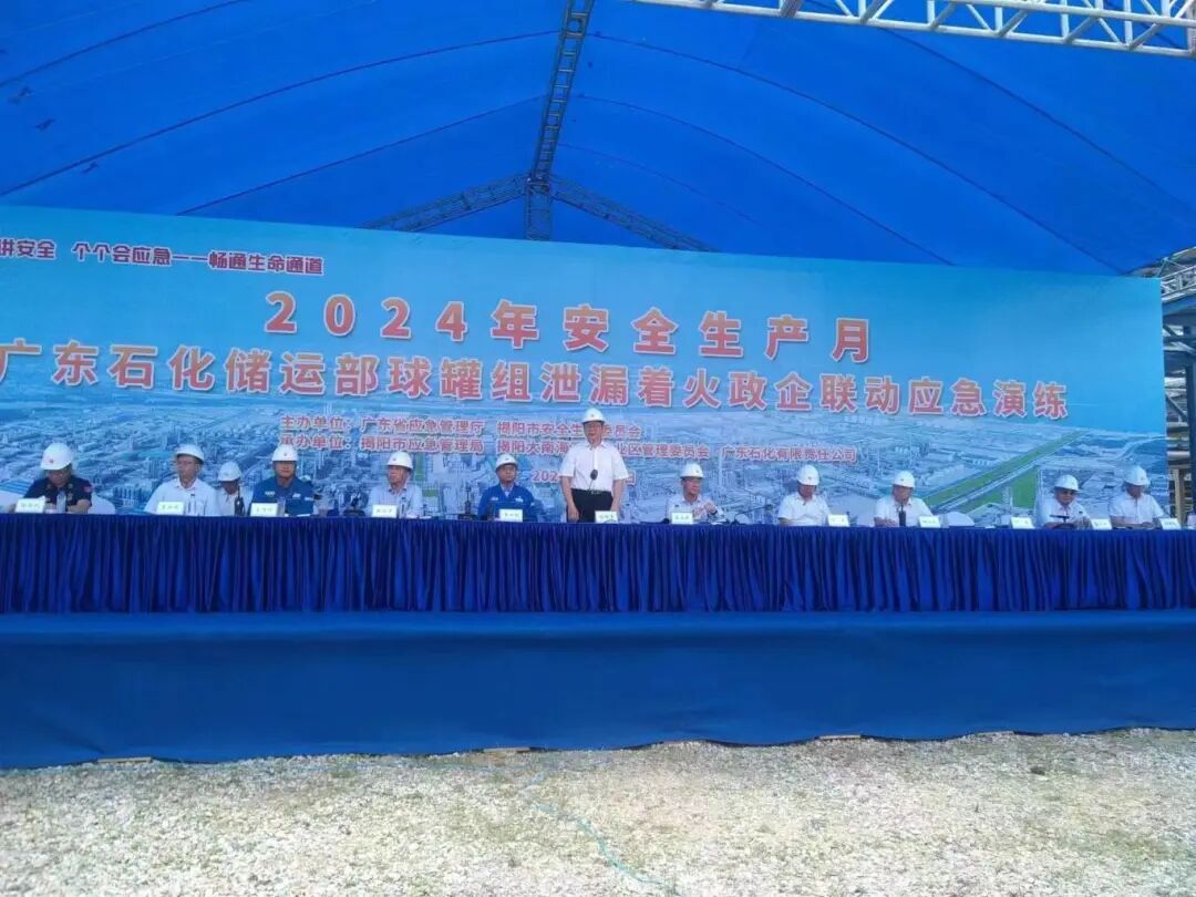 5月31日上午,在2024年全国、全省“安全生产月”活动启动仪式上,省应急管理厅会同揭阳市应急管理局、大南海石化工业区在中国石油广东石化有限责任公司举办了一场以危险化学品泄漏火灾为背景的综合型事故应急演练。省委常委、常务副省长张虎同志视频观摩并以线上方式参加应急演练,省安委办主任、省应急管理厅厅长王再华同志以及省安委会成员单位、各地级以上市安委会负责同志等视频观摩演练。省应急管理厅副厅长高涌涛,揭阳市委常委、常务副市长蔡淡群,中国石油广东石化有限责任公司总经理李力斌等在现场参加演练。