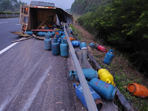 驾驶货车、面包车等不符合标准的车辆运载、液化气罐、煤气罐等危险物品,危险系数大,尤其是在高速路上发生爆胎等交通事故情况下,极易因引发爆炸等二次事故,请广大驾驶人勿拿生命当儿戏,自觉遵守交通法律法规。