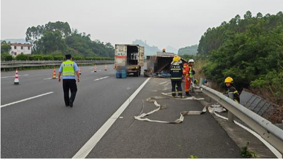 5月15日凌晨5时许,广西壮族自治区公安厅交警总队高速公路管理支队三大队民警接到报警称:一辆大型厢式货车在G72泉南高速公路柳州往南宁方向1353km处发生侧翻,车上疑似装载危化品。