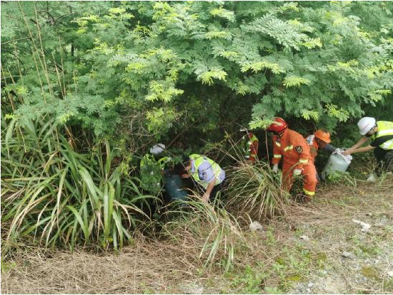 随后,民警及现场应急人员按照各自分工有序开展救援工作,将散落在路面的液化气罐以最快的速度转运至运输车辆上。由于仍有三十多个液化气罐滑落至护栏外山坡下,民警与消防员下山坡合力将三十多个液化气罐抬上路面。