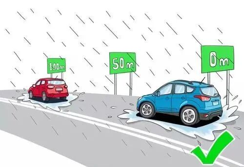 雨天路面湿滑,制动距离比干燥路面要长,请拉大跟车距离,为自己留下处置紧急情况的时间和空间,避免事故发生。