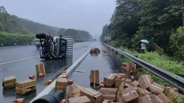 5月20日11时许,惠州高速上一辆厢式货车在行车过程中突然摇摆了几次后,失控碰撞防护栏,然后侧翻在行车道上,运载的食用油撒了一地。