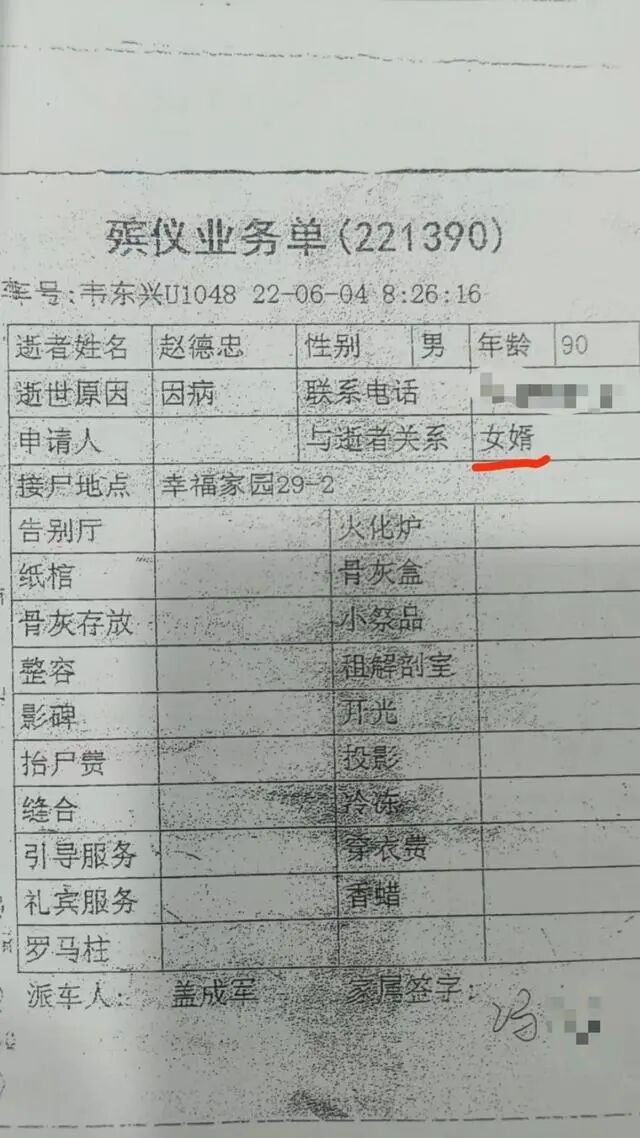 ▲老人的殡仪业务单为保姆儿子签字,关系为女婿(受访者提供)