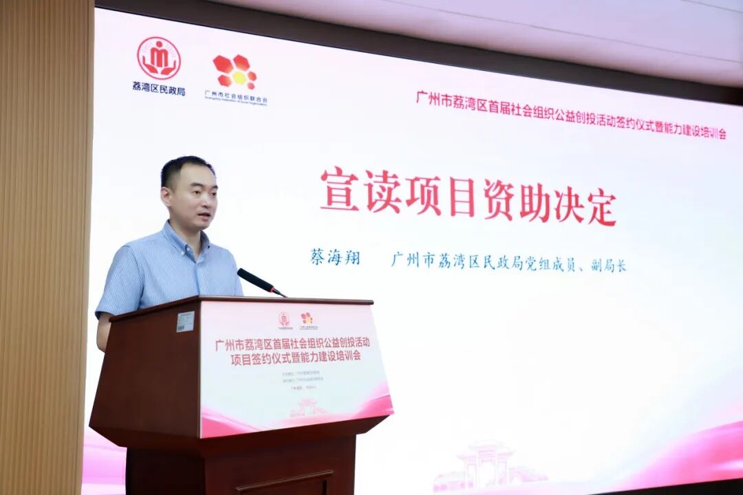 今年是荔湾区首次开展社会组织公益创投活动,在前期的广泛宣传和发动下,吸引了市、区社会组织的关注和申报,申报项目量达到77个。经项目初审、专家评审、项目路演、实地核查等程序,最终确定30个项目获资助。会上,蔡海翔副局长宣读荔湾区首届社会组织公益创投活动资助决定。同时,蔡海翔副局长代表广州市荔湾区民政局、焦杨秘书长代表广州市社会组织联合会,分别与2家创投主体代表现场签约。