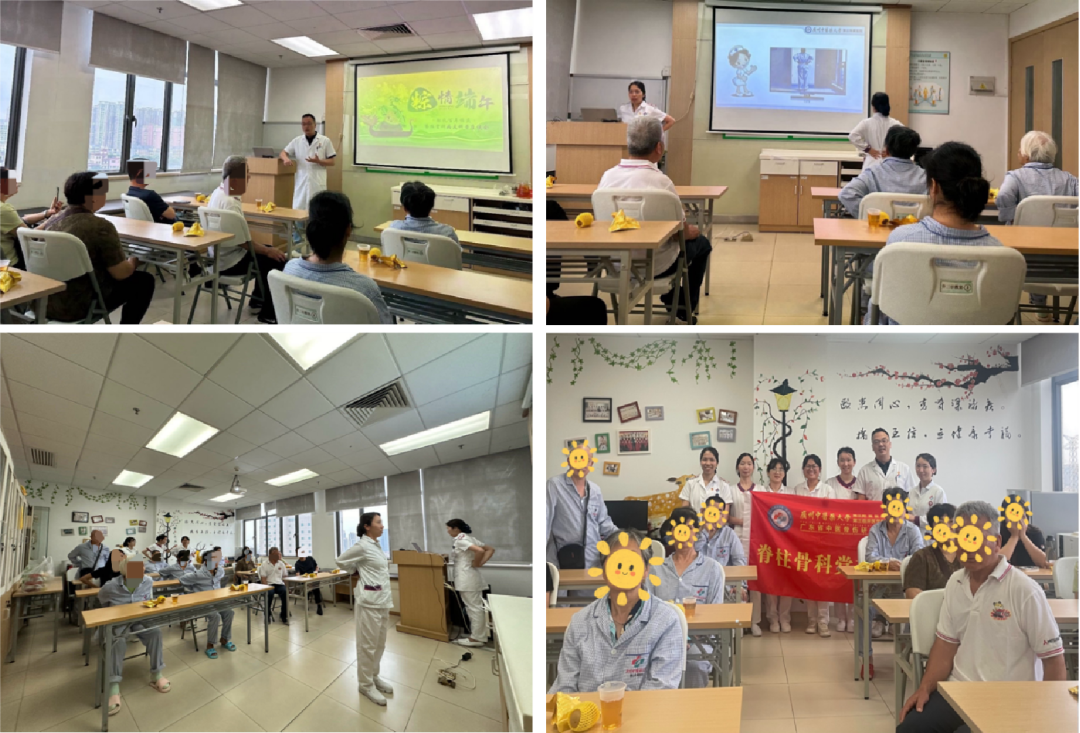 在院本部骨三科(脊柱骨科)一病区主任李颖、护士长欧阳艳菲的带领下,医护人员开展以“粽情端午·献礼百年校庆,科普宣教·齐克脊梁诸疾”为主题的病友科普座谈会,通过现场互动教学等形式,让患者及家属们了解了脊柱骨科中医养生的知识。欧阳艳菲护士长详细讲解如何运用《六式搓腰功》对腰部进行身体调理,以及夏季养生的饮食原则和生活方式。科室护士们一起手把手地指导患者及家属搓腰功的方法、顺序等,生动的讲解和实用的建议赢得了在场听众的阵阵掌声。