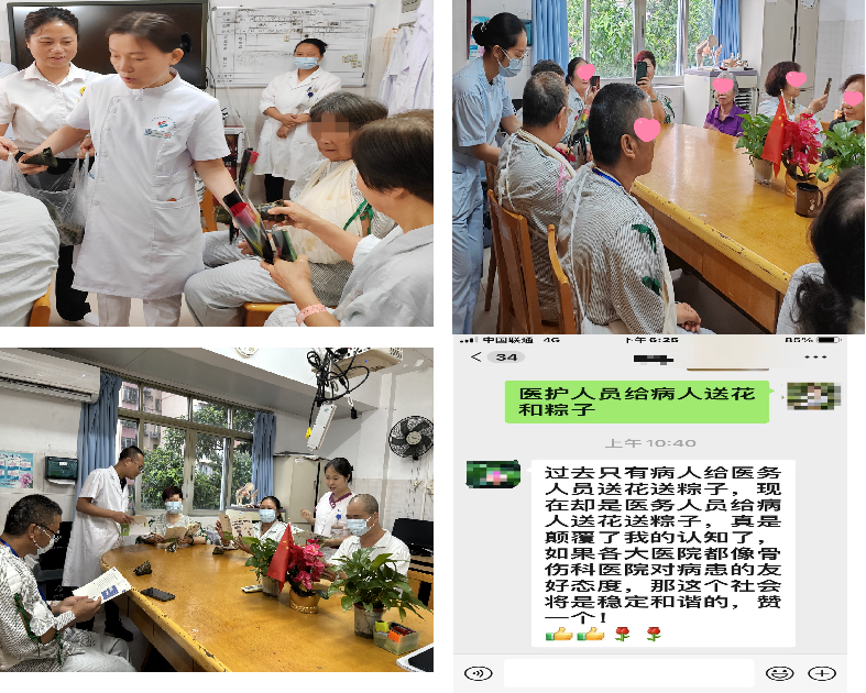 在骨伤科分院骨二科(关节中心运动医学科、筋伤科)主任魏合伟、护士长黎小霞的带领下,科室医护人员特别为病友们送上节日的慰问,为病友们准备鲜花、粽子作为节日礼物,表达医护人员的关爱和祝福。