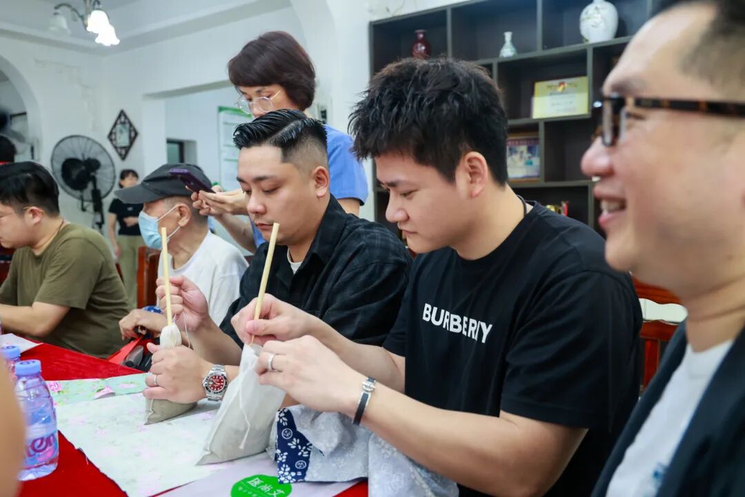 在社区工作人员的指导下,归侨侨眷一齐动手制作用于日常养生保健的端午艾草养生锤,他们分工合作,剪裁布料,将适量的艾草放入布袋中填充,包裹缠绕好后固定打结,一个个外观精美、功能实用的艾草养生锤制作完成了。在满溢的艾草清香中,大家领略到了传统文化的魅力。