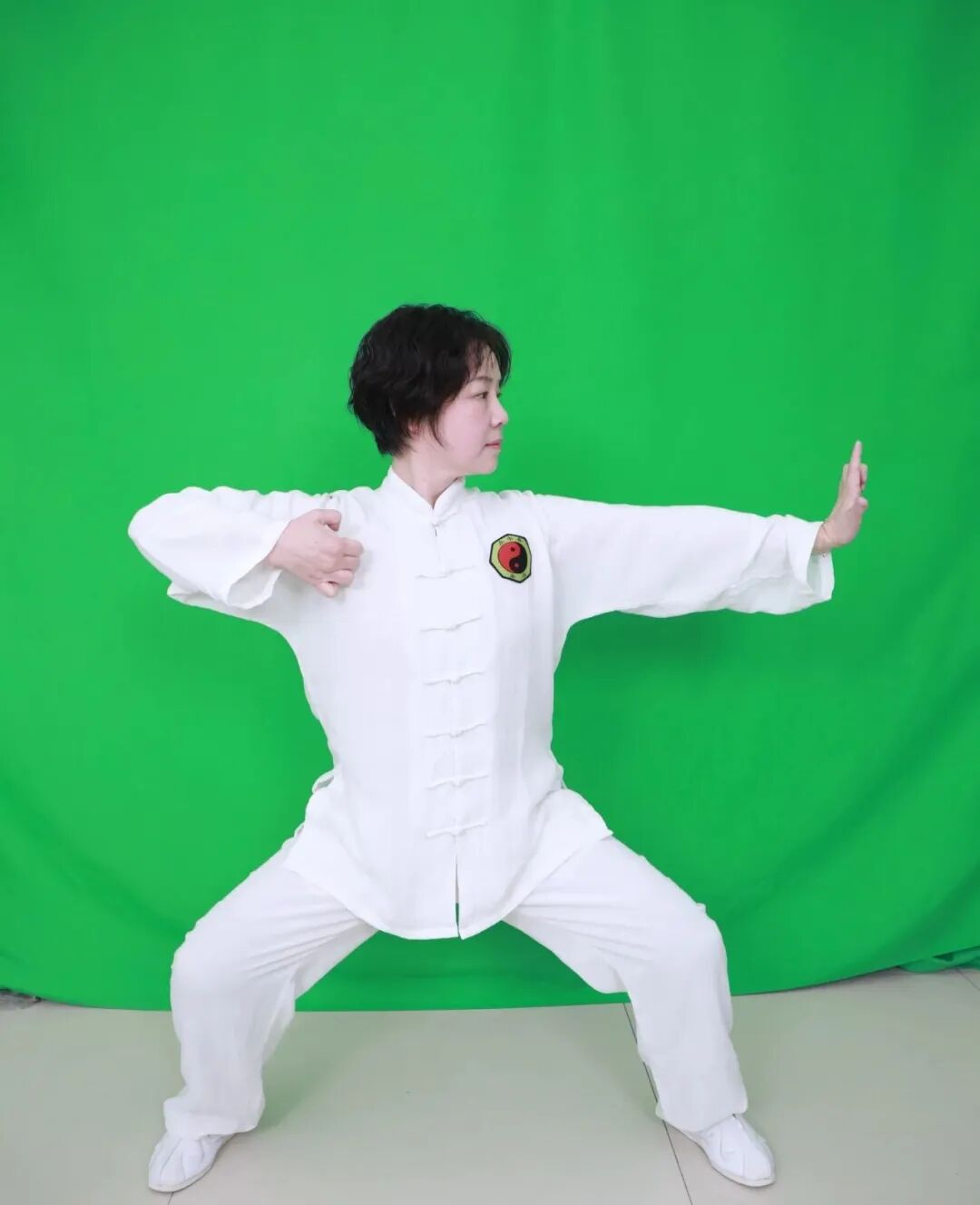 两脚平行开立,下蹲呈马步;两臂胸前交叉,右掌屈指成“爪”握拳,向右拉至肩前;左掌成八字掌,向左侧推出,掌心朝前,与肩同高,如拉弓射箭之势,同时头向左转,目视左掌;复原后左右互换,展臂及拉弓时吸气,复原时呼气。该招式可舒展经筋,畅通腕部气血运行。