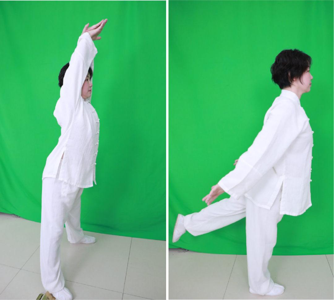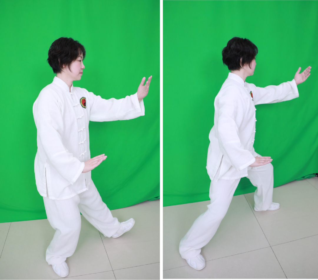 抱球收脚:站立,两脚分开至比肩略宽,右臂屈抱于腹前,右掌下按,左臂先向前伸直,然后微屈,环抱于胸前,左掌心向内;右腿屈曲,左脚向右脚内侧收,呈丁步。弓步分手:上体左转,左脚向左前方迈出一步,呈左弓步;同时左手略微向前伸,右手按至右胯旁。该招式可促进腕部气血运行、活血通络、滑利关节。