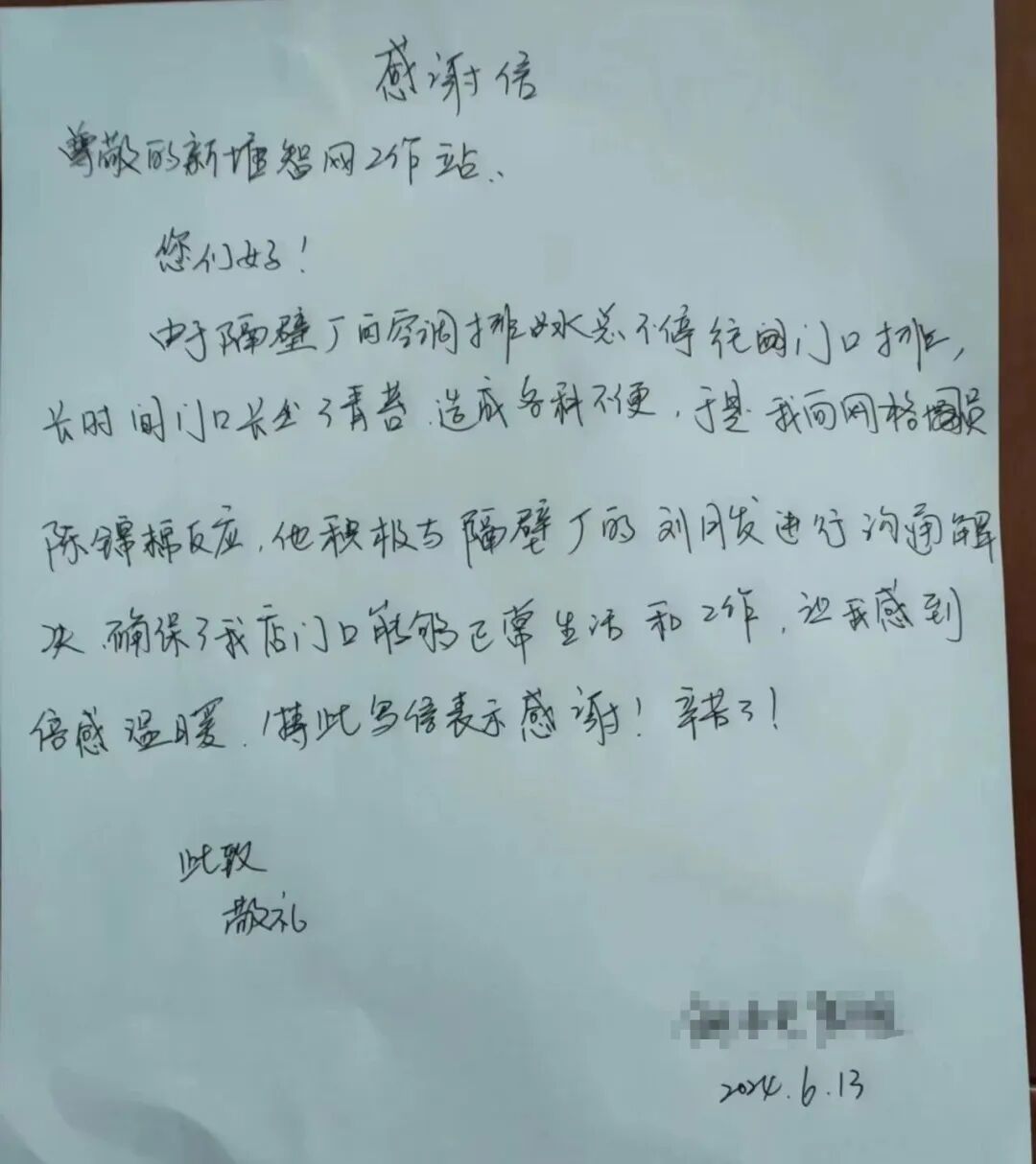经网格员与工厂负责人协商,厂方同意将该排水管停用,改设排水管于工厂楼顶,同时,网格员联系社区调派环卫工对该水管附近的路面和墙身青苔进行清理。事后,店主对网格员的妥善处置致予手写表扬信感谢。