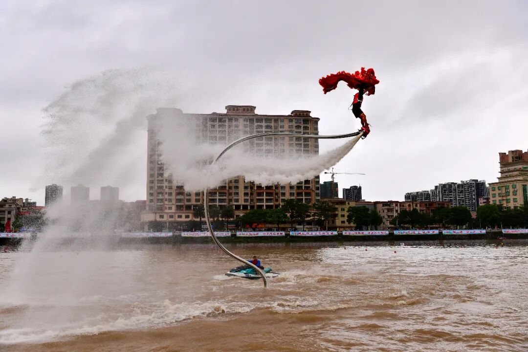 值得一提的是,比赛期间,水上飞人现场进行了精彩的水上“舞狮”表演,演出者举着“狮头”在空中做出各种高难度动作,犹如狮子飞在空中飞舞,令人大开眼界,有网友卖力点赞:“非遗”飞起来啦!