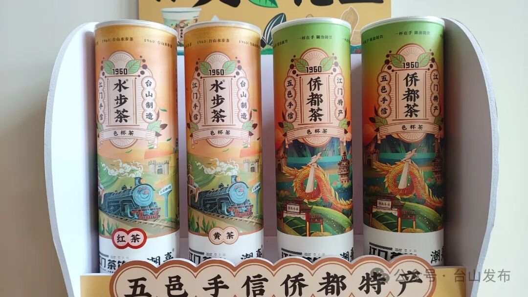 江门市潮熹食品有限公司总经理蒋雄辉:我们比较有特色的产品如“水步茶”“侨都茶”,都融入当地一些元素,在外包装上加入了台山站、火车、新宁铁路以及炉底糍、黄鳝饭,以及具有水步特色的冈宁圩、碉楼、草坪里等元素。