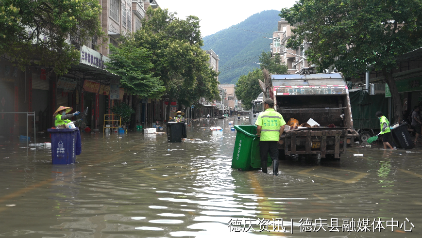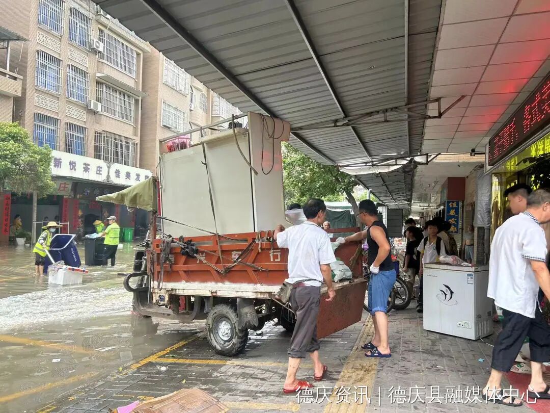 有环卫工人在清理垃圾,即将被淹的商铺在不慌不忙的收拾东西,把电器、食材等搬走,防止被淹。由于地势低洼,这里的居民几乎家家户户都备有船只,居民们表示,洪水对他们的生活影响不大,因为镇政府未雨绸缪、提前通知和部署,他们昨天已经收拾好东西,搬上高楼层或者转移住所。居民冼叔说:“因为政府提早通知,有足够的时间给我们收拾东西,昨晚六点钟之前,基本上将所有的家用物资,还有店铺商品全部搬好转移了,因为大家都已经习惯了并没有担心,我现在就收拾了一些行李,回县城住。”