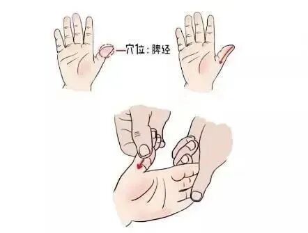 脾经在大拇指外侧,赤白肉交际处。屈曲宝宝拇指,由指尖快速推向指根200~500次。