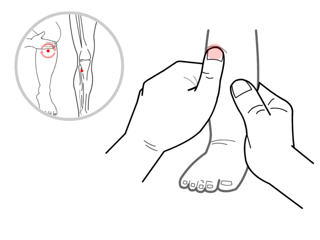 足三里穴在外膝眼下3寸,胫骨旁1寸,用拇指按揉该穴共300次。
