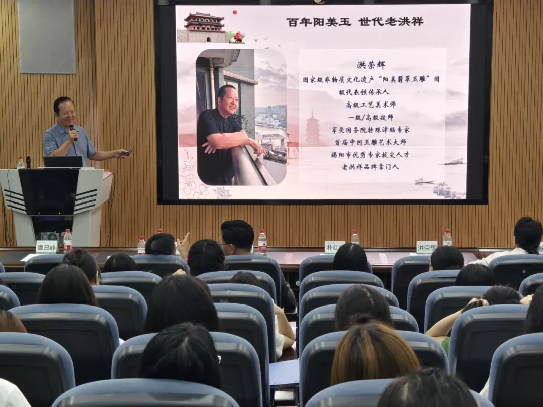 6月20日,2024广东省非遗传承人群种子计划校园宣讲会暨“非遗进校园”讲座走进广东省外语艺术职业学院(简称“广外艺”),玉雕(阳美翡翠玉雕)国家级代表性传承人洪荣辉为学生现场授课,“洪荣辉大师工作室”也在现场揭牌。广外艺副校长朴红梅、广东省工艺美术大师李牧祥、广外艺艺术设计学院党委书记曾林、广外艺艺术设计学院院长王大勇、广外艺艺术设计学院副院长谭日峥,以及该校学生共约100人参与本次活动。