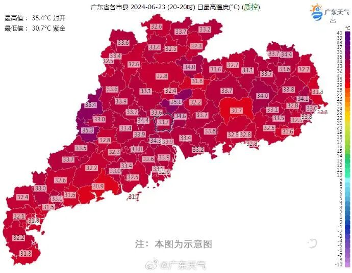 在副热带高压大Boss的“撑腰”下,这几天广东大部的最高气温飙到了33℃~36℃。就在昨天(6月23日),广东最高气温普遍超32℃,封开甚至以35.4℃高温排名全省第一。