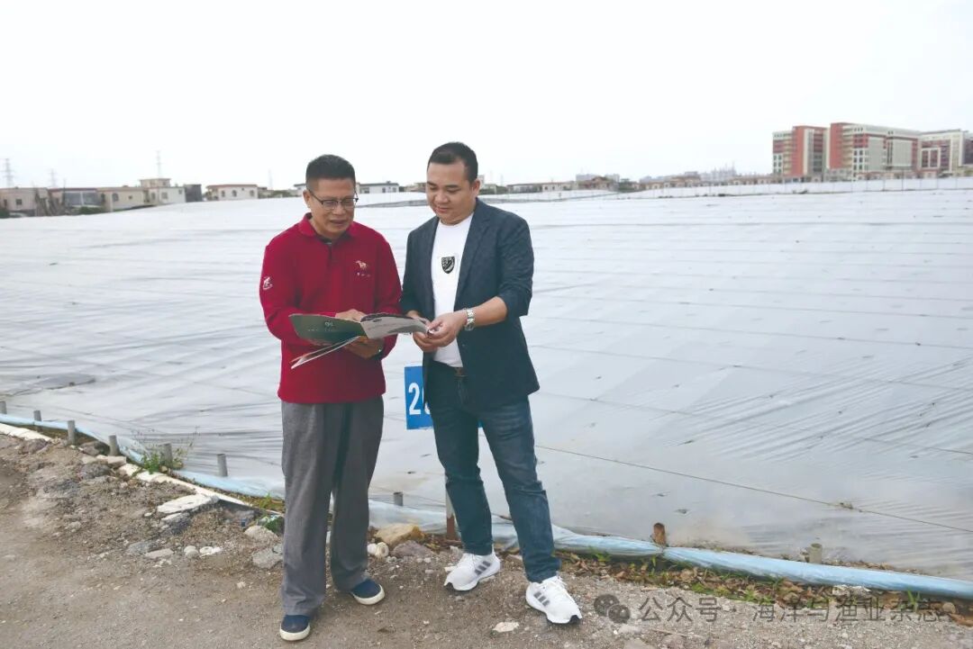 ▲ 阜沙镇农业服务中心高级工程师林沛棠与养殖户梁少文交流技术