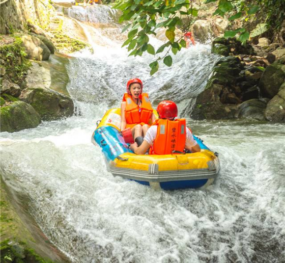 漂流河道源于号称“广州第一峰”的天堂顶山脉,由百瀑千泉汇聚成河,蜿蜒在幽深险峻的峡谷中。碧水峡高山漂流河段全程3.8公里,分为三个漂段,分别为勇猛漂(3.8公里)、激情漂(2.3公里)和休闲漂(1.6公里),漂流时间为40至90分钟,总体落差近380米,全程河道变化多段,曲折迂回。