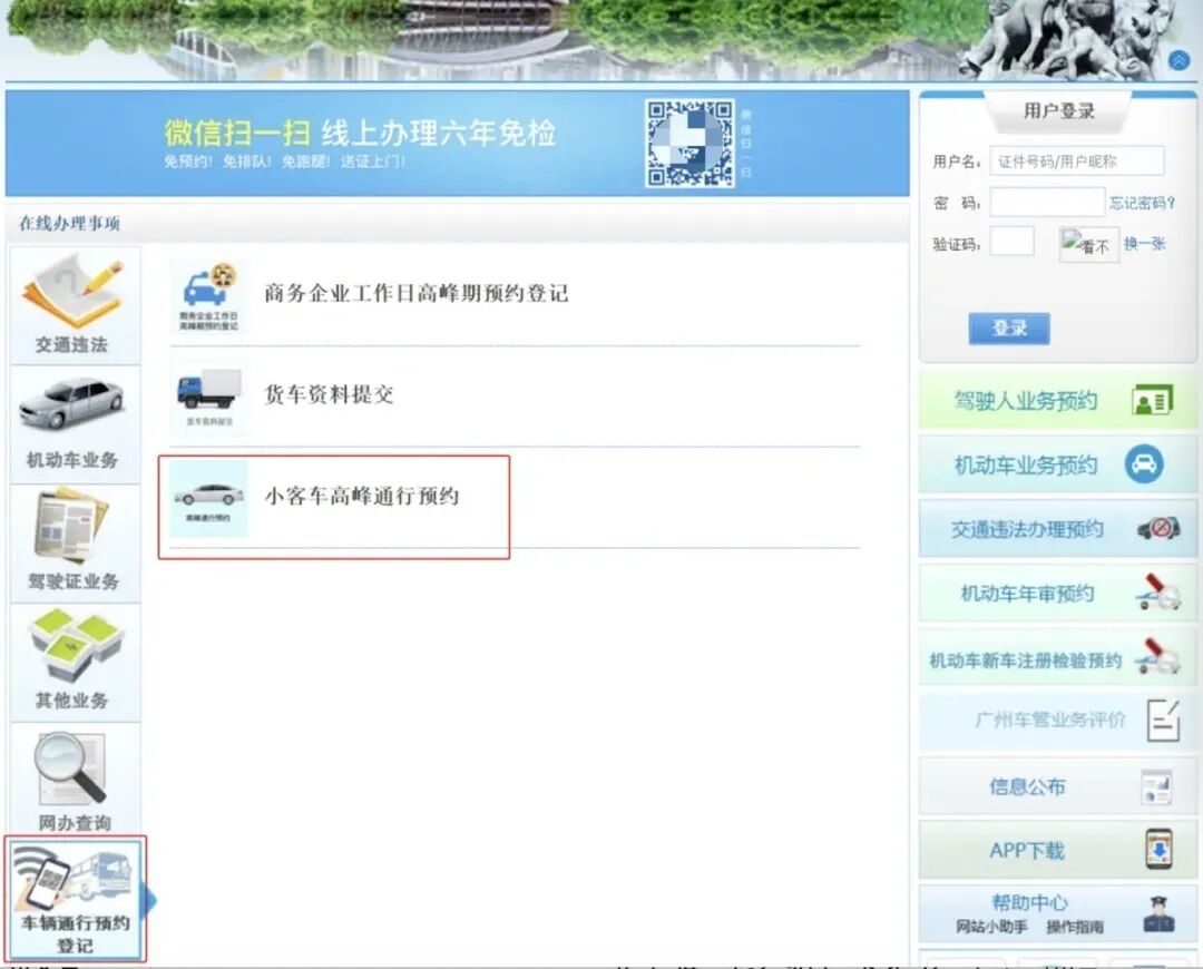 登录广州市公安局门户网站,进入网上车管所页面,点击车辆通行预约登记,点击小客车高峰通行预约,进入申请页面。