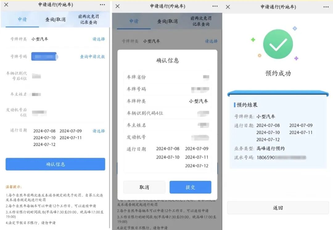 申请通行预约时,会校验车主姓名、号牌号码、车辆识别码后四位、发动机号后六位,若输入有误则无法提交。