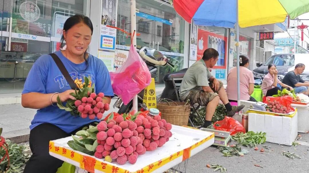 商贩韦小香说:“目前主要卖的是‘观音绿’、‘禾枝’和‘仙进奉’,今年雨水太大了,糯米糍和桂味量少,‘仙进奉’刚刚上市,把‘禾枝’销得差不多接下来就是主卖‘仙进奉’。”