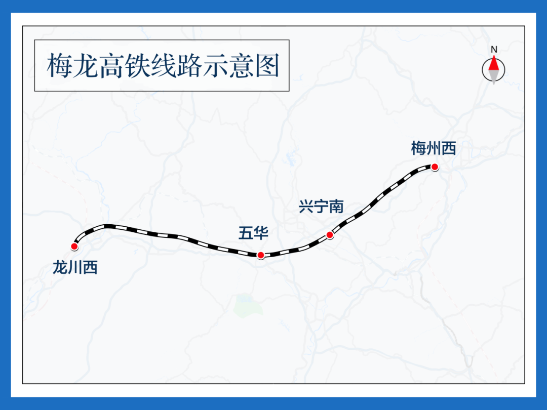 梅龙高铁正线全长93.982公里,设计时速350公里,自梅汕高铁梅州西站引出,途经梅州、兴宁、河源等城市,终至赣深高铁龙川西站,全线设4座车站,新建兴宁南站、五华站,是首条由广东省全额投资建设的高速铁路。