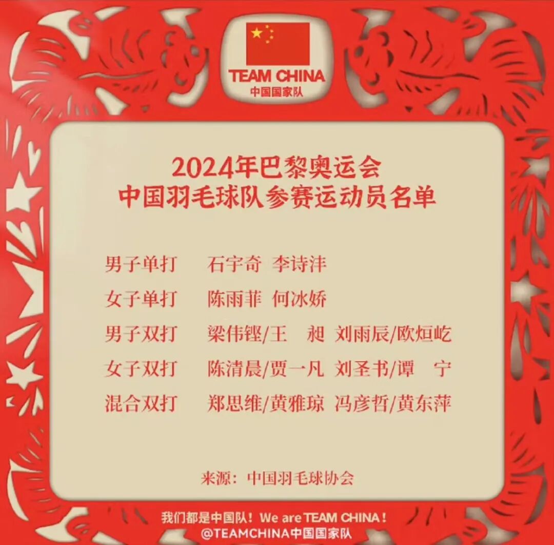 近日,中国羽毛球协会发布了关于公示羽毛球项目2024年巴黎奥运参赛运动员名单的通知。
