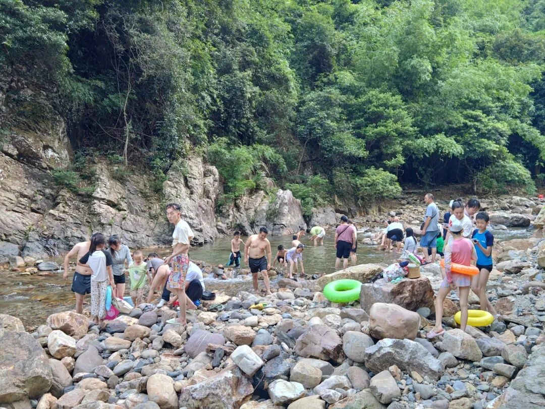 走进黄石清溪景区,深幽的峡谷内溪水蜿蜒,在森林茂盛、重峦叠嶂的山峰环绕下,不少群众成团组队在碧水清潭边戏耍。孩子们有的搬起小石子叠起小小的水坝,有的拿着渔网试图抓鱼,有的带着游泳圈“漂流”,家长或加入其中,或仔细守护,现场一片幸福快乐的场景。